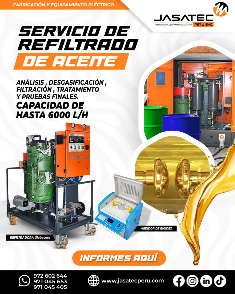 Con el fin de conservar en buen estado el aceite aislante mineral y por consiguiente del transformador, se realiza el servicio de reacondicionamiento del aceite, el cual consiste en la eliminación de agua y partículas sólidas en suspensión, elevando notablemente la rigidez dieléctrica. Con máquinas de 6000 y 600 litros 100% certificadas de la marca GlobeCore asegurando la calidad del servicio.